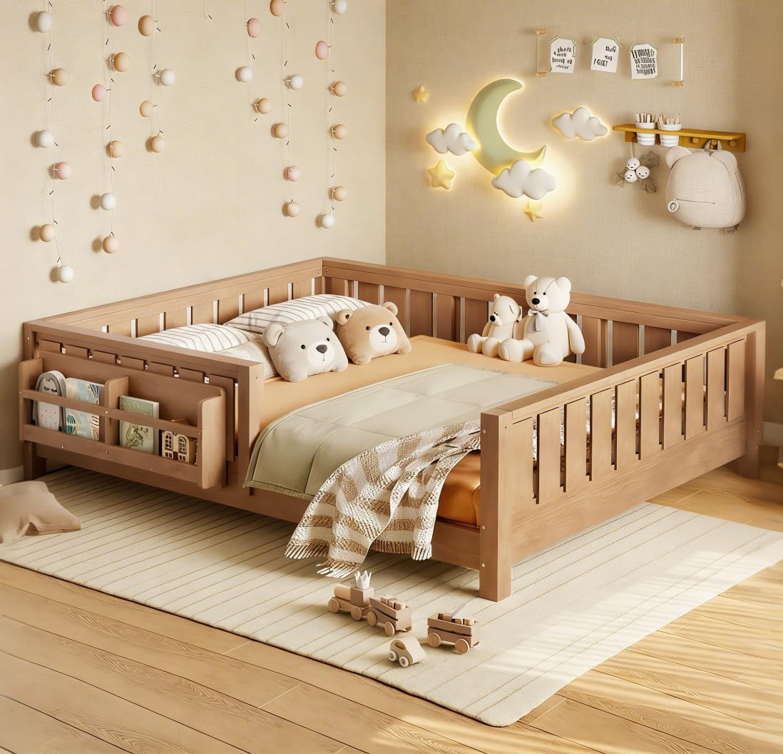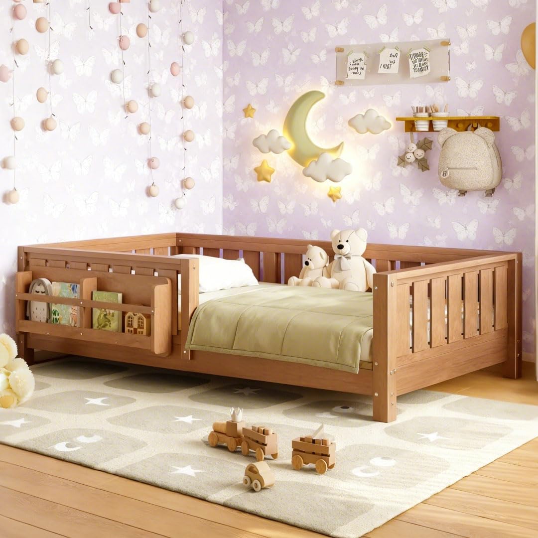 This Solid Wood Platform Bed Frame with Bookshelf for Kids ingeniously combines playful design with practical functionality, creating a dreamy and comfortable sleeping space for children. The built-in Bookshelf at the headboard is not only a dedicated corner for storing bedtime storybooks but also creates a warm and reassuring atmosphere for parent-child reading. Its unique Floor Bed design, which is low to the ground, is paired with a High-Quality Safety Guardrail, ensuring absolute safety while encouraging children to get in and out of bed independently, effectively fostering independence and confidence. Parents need not worry about their children's safety when sleeping alone. The entire bed is made of Sturdy and Durable Construction and supports Easy Assembly, making it an ideal children's bed that balances fun, safety, and growth needs.